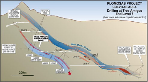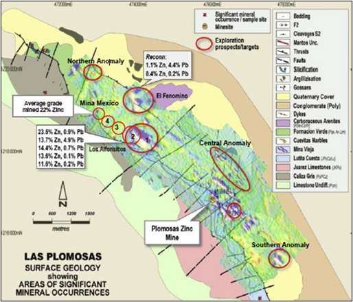 The property hosts extensive carbonate replacement deposit-type ("CRD") zinc-lead-silver “mantos”. IMPACT is currently conducting an extensive drill program near mine targets as well as new targets on the 6 km prospective trend and untested copper-gold targets with high-grade surface prospecting samples. Regionally, Plomosas lies within the same mineral belt as some of the world's largest carbonate replacement deposits.